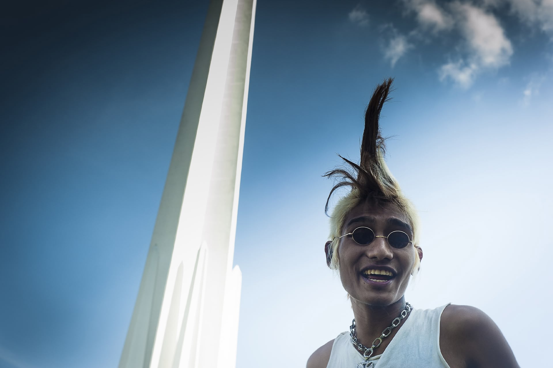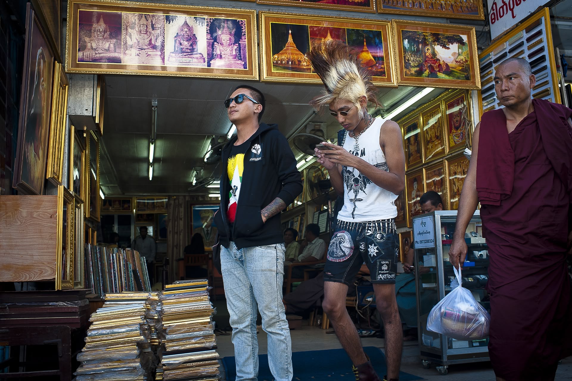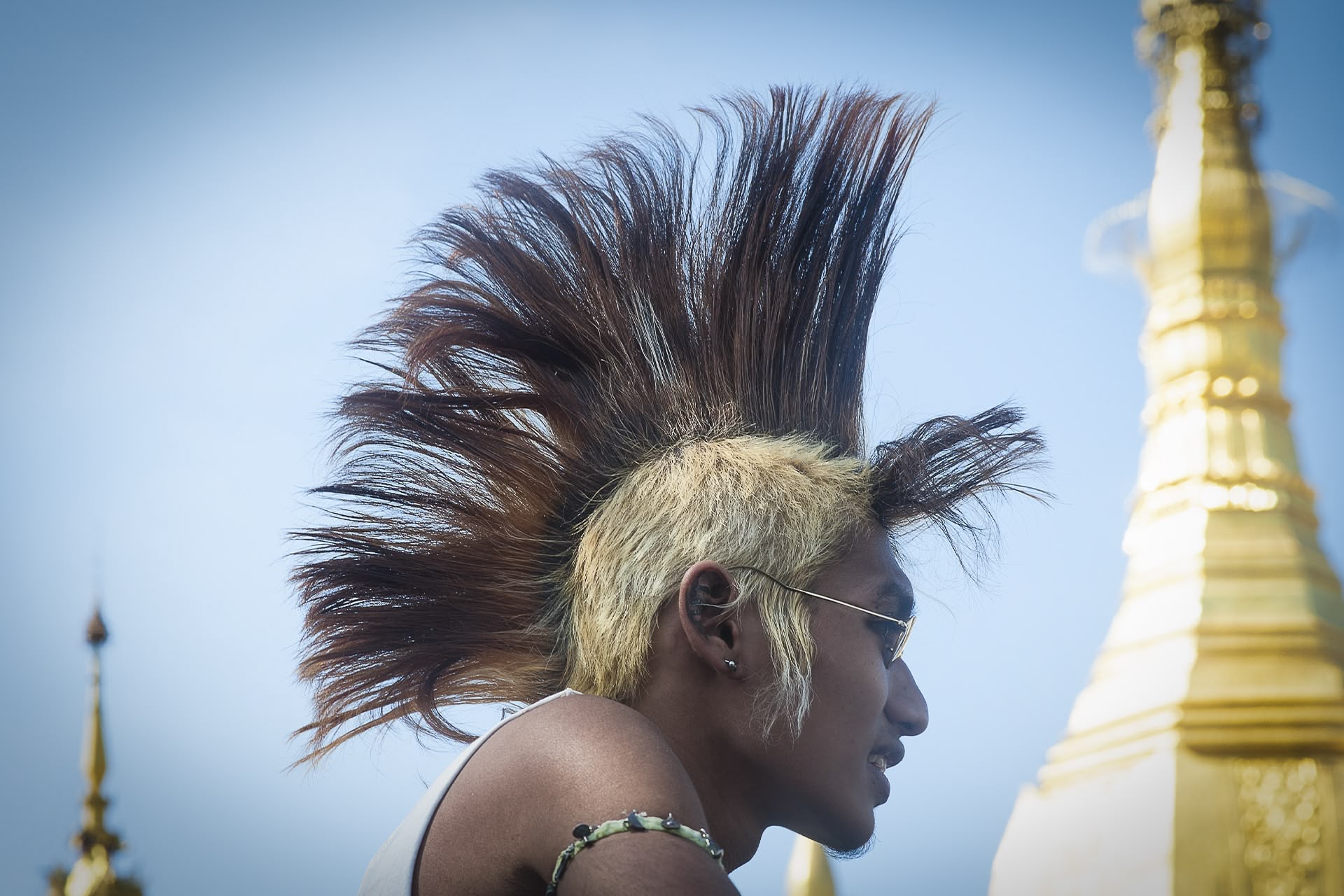 The punk movement was a huge middle finger to the world. This was the style the punks of Rangoon and other Burmese cities embraced. As in the UK, there was a political context: fifty years of repressive military rule, accompanied by economic austerity, pervasive surveillance, and official paranoia, all overlying a pious Buddhist culture bent out of shape by nearly a century of colonialism punctuated by war. …Punk began to emerge in Burma around the time of the Saffron Revolution of 2007, when huge processions of barefoot monks pounded city streets all over the country in defiance of military rule. It was a watershed moment for the democracy movement, and despite the vicious way it was brought to an end, it lent courage to dissenters of every sort, the punks among them. Take Satt Mhu Shein, Tamagni's favorite subject, who has adopted the name Einstein MC King Skunk. He boasts the typically punk mohawk haircut but has dyed it blond as it approaches his scalp... Burma remains a highly conservative society, and Einstein's look is guaranteed to have an effect. In one of Tamagni's photographs, his blond mohawk forms a visual counterpoint to the golden pagoda of Shwe-dagon, Burma's most famous and revered Buddhist monument.